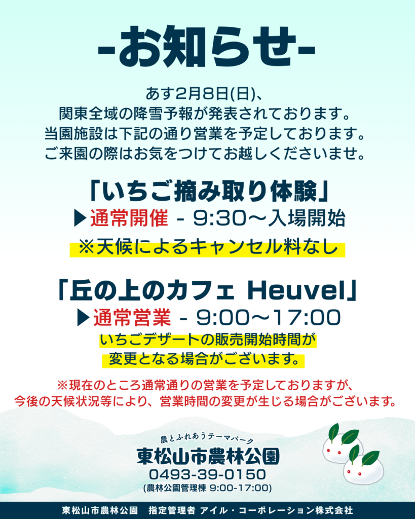 「2/8(日)の降雪予報に伴う営業とご来園時のお願い」