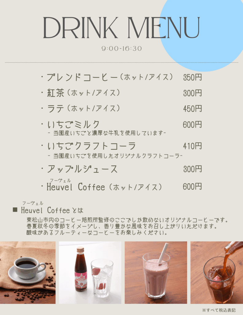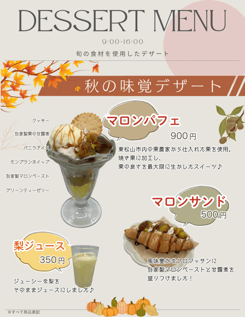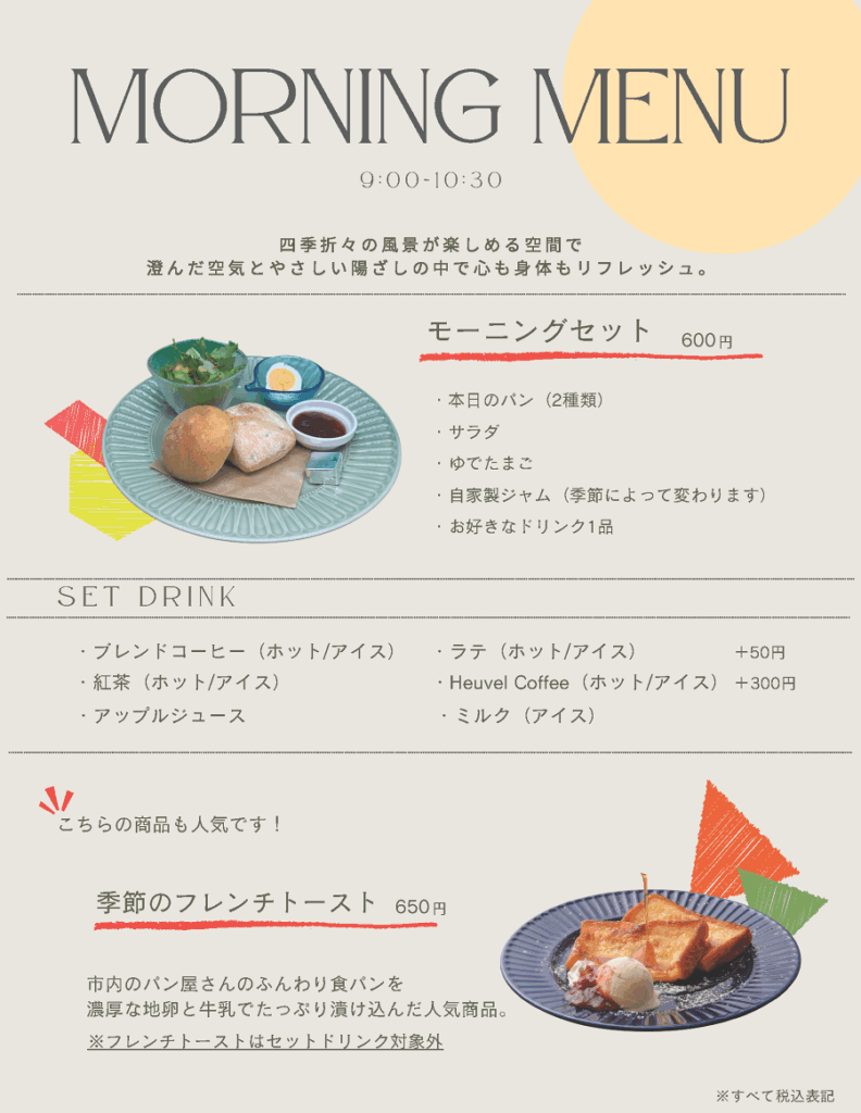 モーニングメニュー(9:00 ~ 10:30) ランチメニュー(11:00 ~ 14:00) デザートメニュー(9:00 ~ 16:00) グランドデザートメニュー 期間限定デザートメニュー ドリンクメニュー(9:00 ~ 16:30)